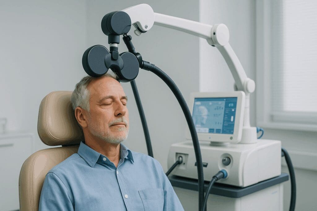 TMS uses magnetic fields to stimulate nerve cells in the brain involved in mood regulation. It is non-invasive and does not require anesthesia, making it more appealing to seniors wary of hospitalization. Unlike ECT, TMS typically has fewer cognitive side effects and can be administered in an outpatient setting. While not entirely free of risk, its growing acceptance as a no-drug depression treatment similar to ECT has positioned it as a promising intervention for treatment-resistant MDD (major depressive disorder) in older adults.